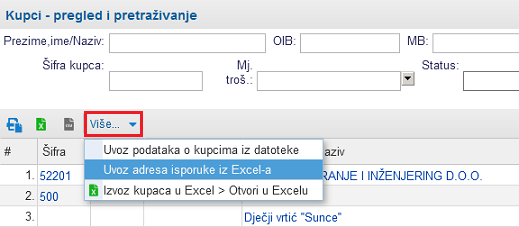 Ukoliko kupac ima više adresa isporuke, na raspolaganju nam je opcija uvoza popisa adresa isporuke iz datoteke. Datoteka može biti u formatu Excel, OpenOffice Calc, csv.